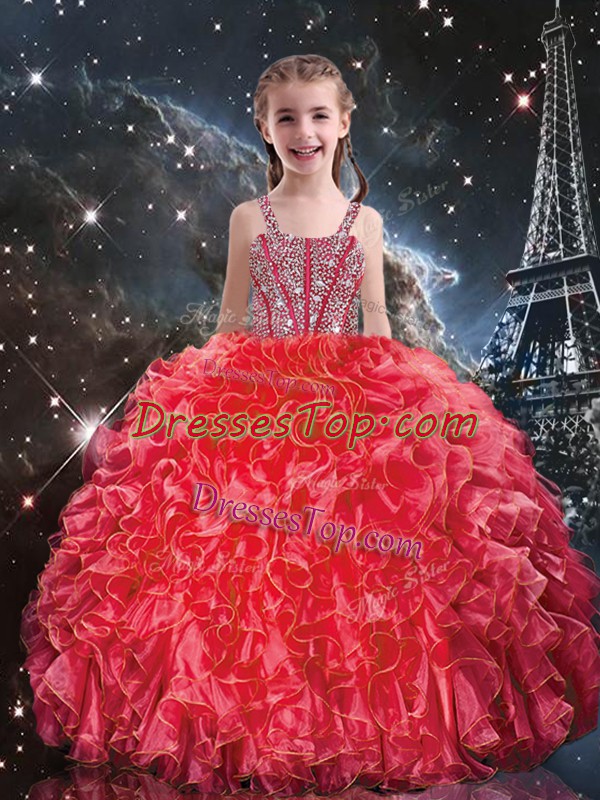 Customized Coral Red Organza Lace Up Straps Sleeveless Floor Length Kids Pageant Dress Beading and Ruffles