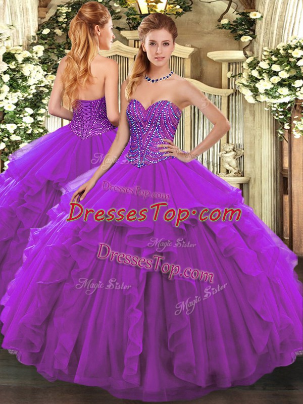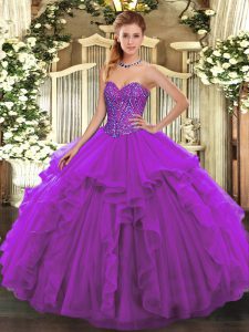 Customized Eggplant Purple Ball Gowns Sweetheart Sleeveless Tulle Floor Length Lace Up Beading and Ruffles Quinceanera Gowns