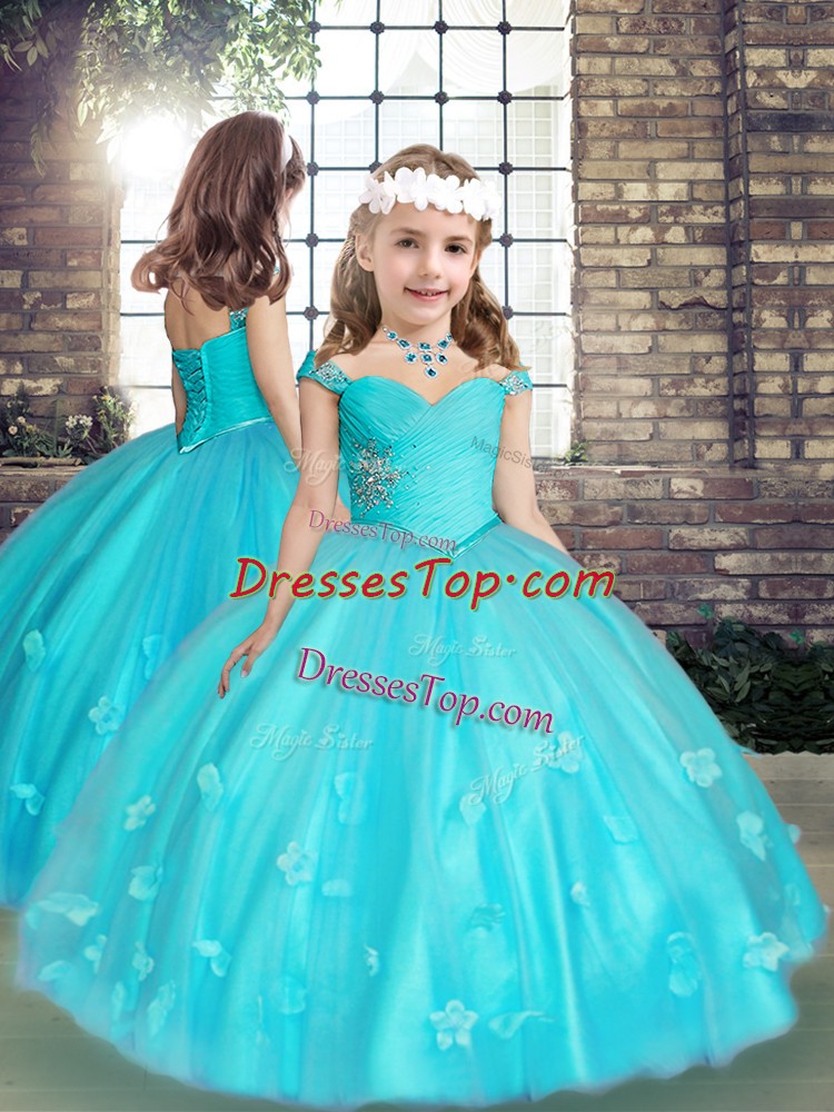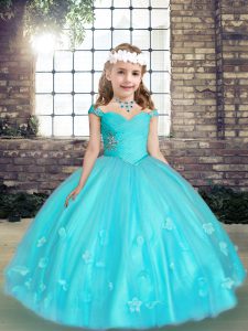 Customized Floor Length Aqua Blue Custom Made Pageant Dress Tulle Sleeveless Beading and Hand Made Flower