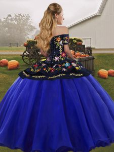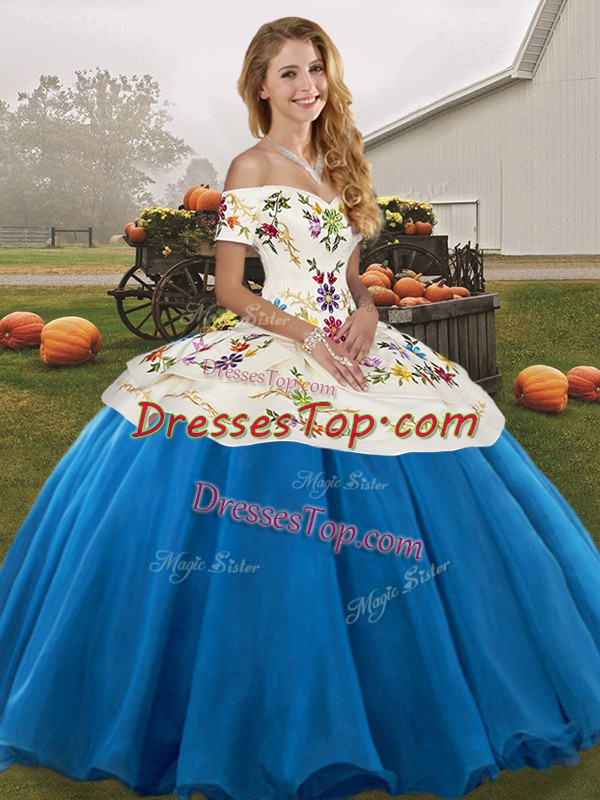 Customized Floor Length Blue And White Quinceanera Gown Tulle Sleeveless Embroidery