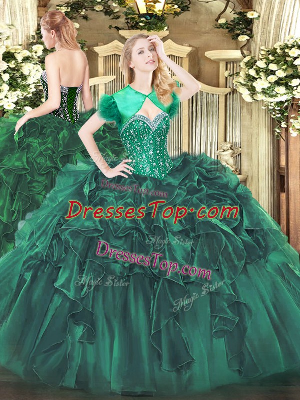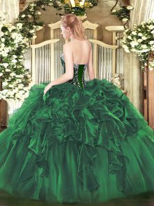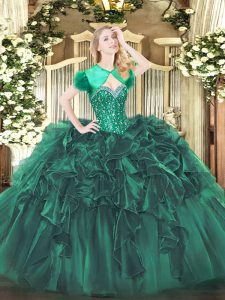 Customized Floor Length Lace Up Quinceanera Dress Dark Green for Military Ball and Sweet 16 and Quinceanera with Beading and Ruffles