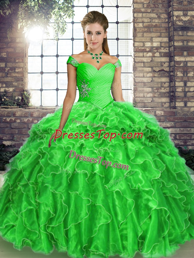 Customized Green Ball Gowns Organza Off The Shoulder Sleeveless Beading and Ruffles Lace Up Quinceanera Dress Brush Train