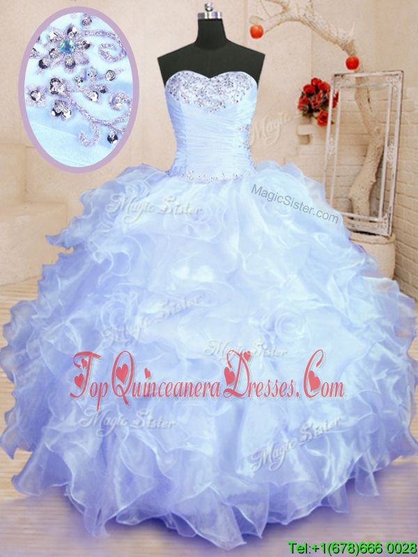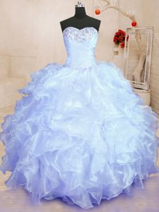 Customized Lavender Organza Lace Up Quinceanera Dresses Sleeveless Floor Length Beading and Ruffles
