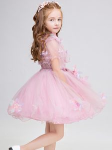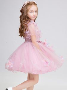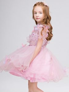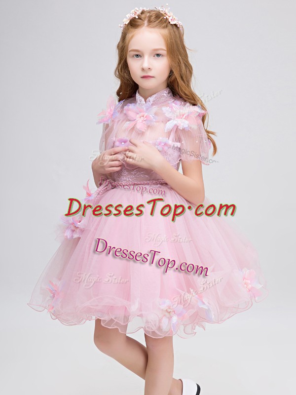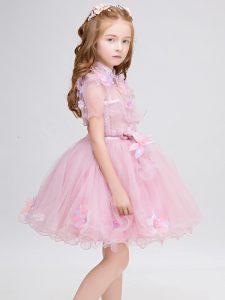 Customized Mini Length Baby Pink Little Girl Pageant Dress High-neck Short Sleeves Zipper