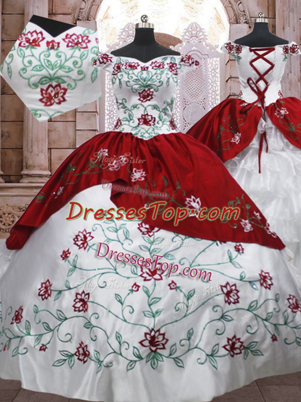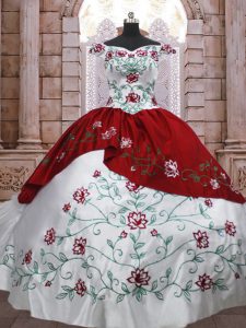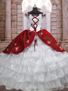 Customized Off The Shoulder Sleeveless Lace Up 15 Quinceanera Dress White And Red Taffeta
