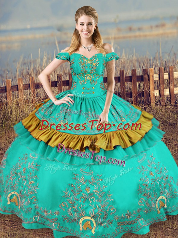 Customized Off The Shoulder Sleeveless Lace Up Sweet 16 Quinceanera Dress Turquoise Satin