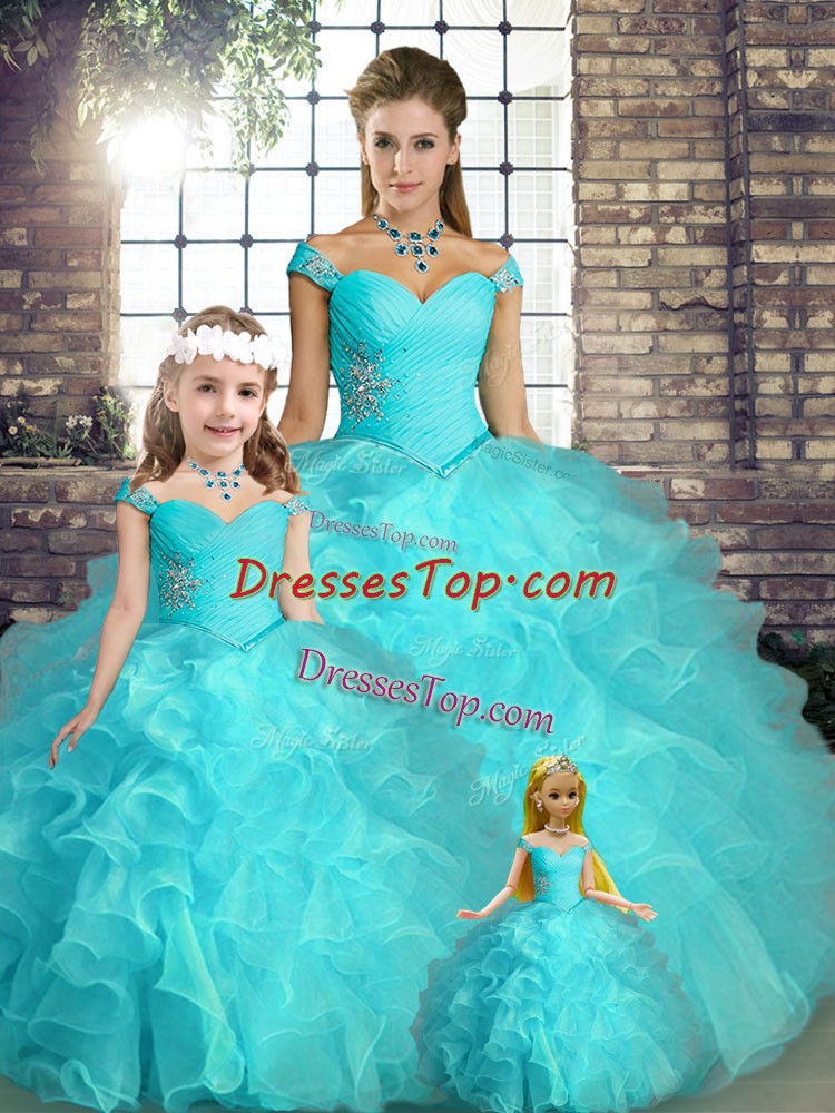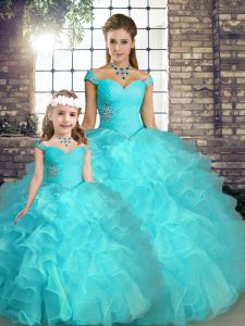 Customized Off The Shoulder Sleeveless Lace Up Vestidos de Quinceanera Aqua Blue Organza