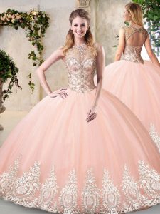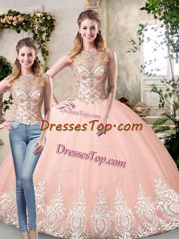 Customized Peach Sleeveless Beading and Lace and Appliques Floor Length Sweet 16 Dresses