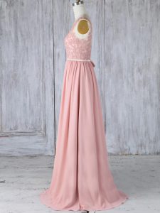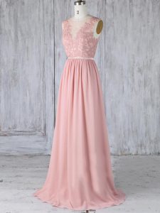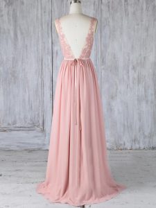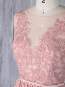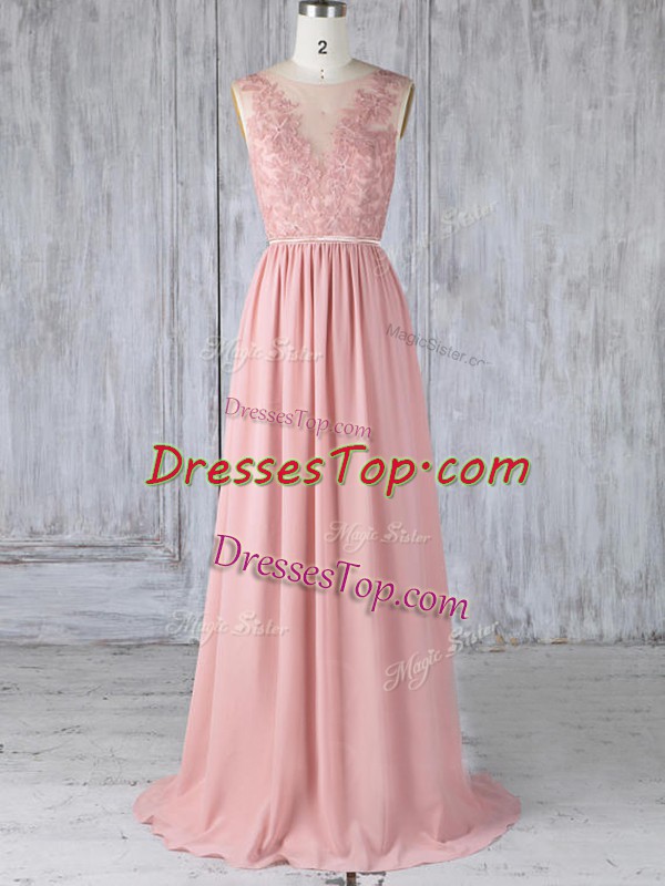 Customized Pink Backless Scoop Appliques Quinceanera Dama Dress Chiffon Sleeveless Sweep Train