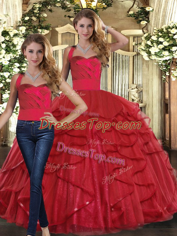 Customized Red Sleeveless Floor Length Ruffles Lace Up 15th Birthday Dress