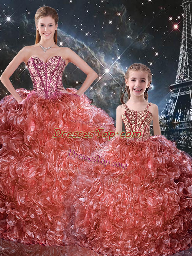 Customized Rust Red Organza Lace Up Sweetheart Sleeveless Floor Length Quince Ball Gowns Beading and Ruffles