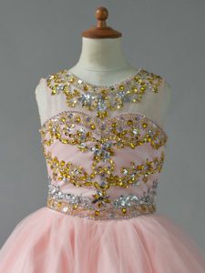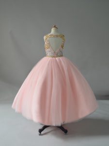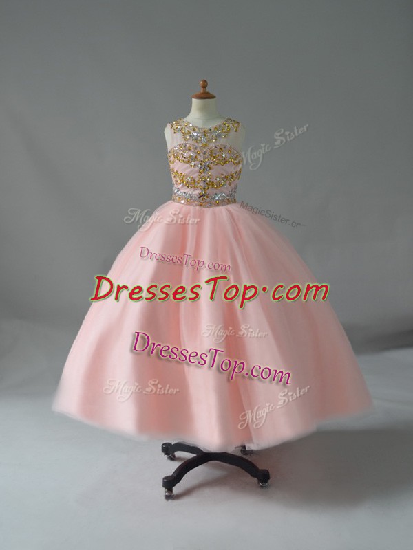 Customized Scoop Sleeveless Girls Pageant Dresses Floor Length Beading Pink Tulle