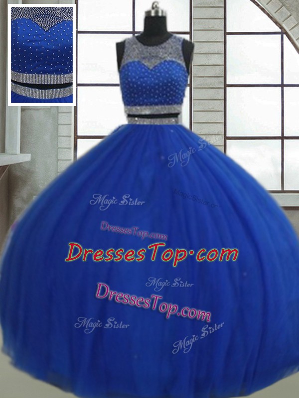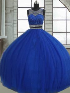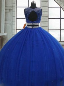 Customized Scoop Sleeveless Quinceanera Dresses Floor Length Beading and Sequins Royal Blue Tulle