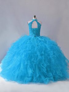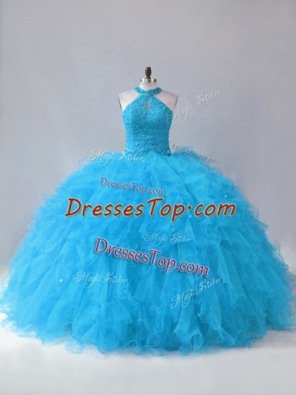 Customized Sleeveless Floor Length Beading and Ruffles Lace Up Vestidos de Quinceanera with Blue