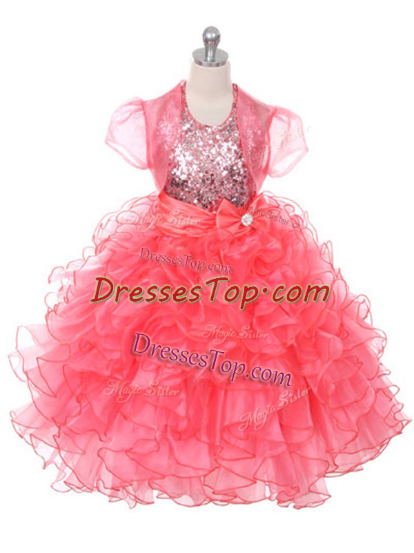 Customized Sleeveless Organza Floor Length Lace Up Pageant Dress for Teens in Coral Red with Ruffles and Sequins and Bowknot