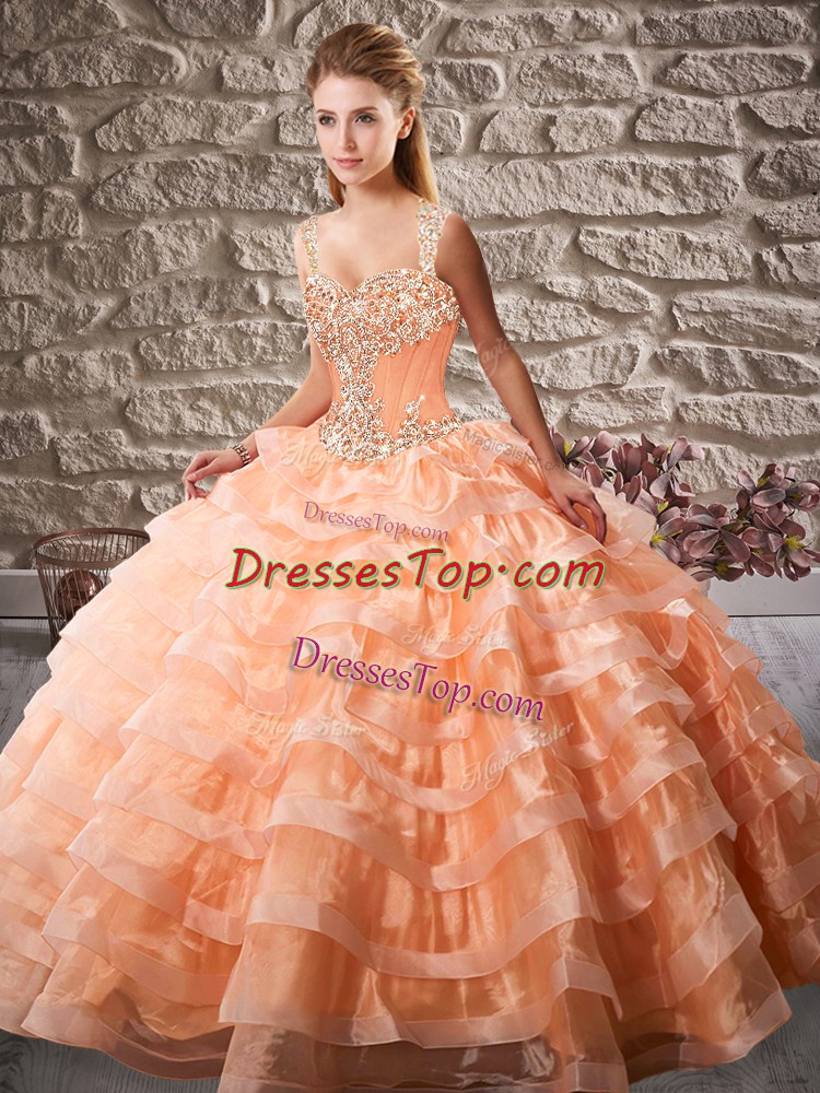 Customized Straps Sleeveless Court Train Lace Up Sweet 16 Quinceanera Dress Orange Organza