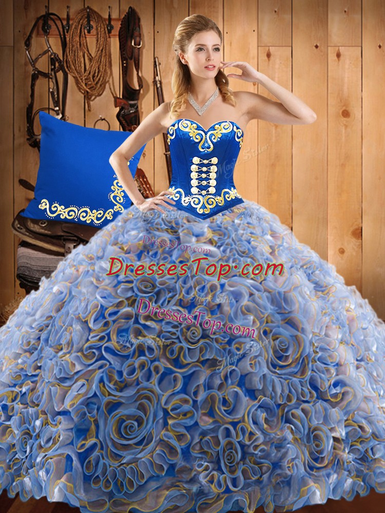 Customized Sweetheart Sleeveless Quince Ball Gowns With Train Sweep Train Embroidery Multi-color Satin and Fabric With Rolling Flowers