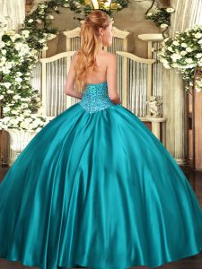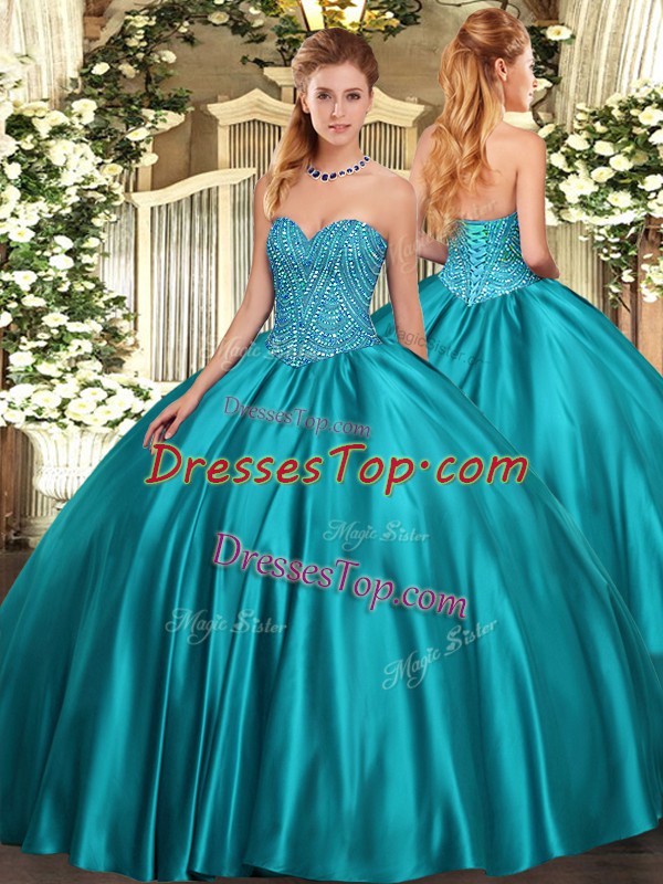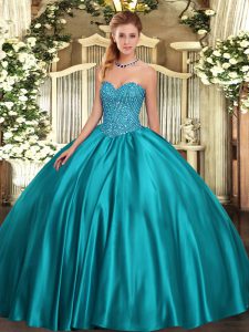 Customized Teal Ball Gowns Sweetheart Sleeveless Satin Floor Length Lace Up Beading Quince Ball Gowns