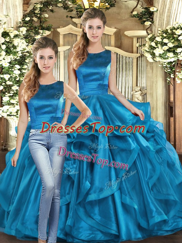 Customized Teal Two Pieces Organza Scoop Sleeveless Ruffles Floor Length Lace Up Quinceanera Gowns