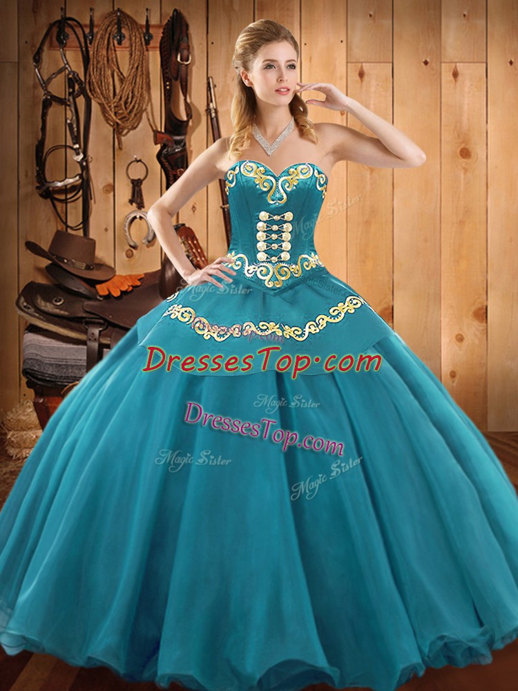 Customized Tulle Sweetheart Sleeveless Lace Up Embroidery Sweet 16 Dresses in Teal