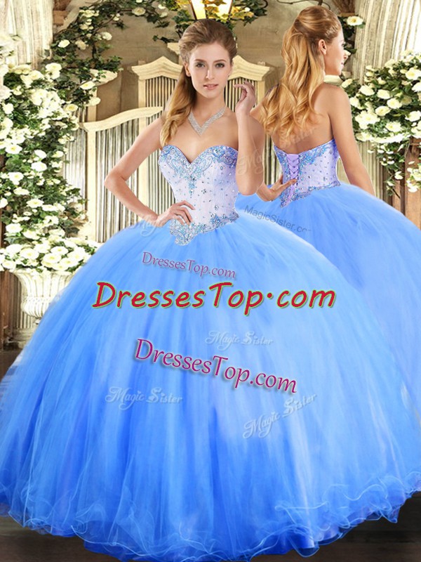 Cute Baby Blue Sleeveless Beading Floor Length Quinceanera Gowns