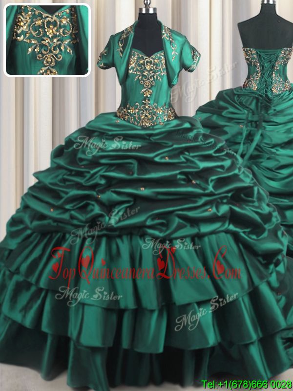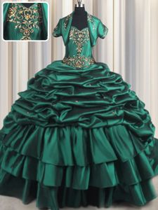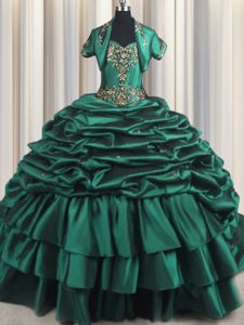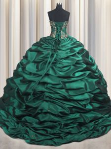 Cute Beading and Appliques and Pick Ups 15th Birthday Dress Peacock Green Lace Up Sleeveless With Brush Train
