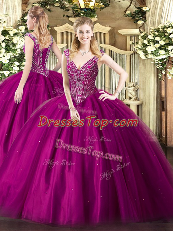 Cute Beading Quinceanera Gowns Fuchsia Lace Up Sleeveless Floor Length
