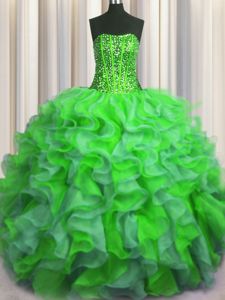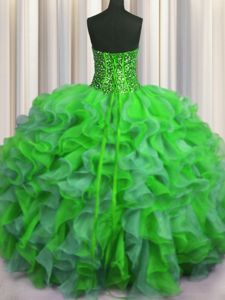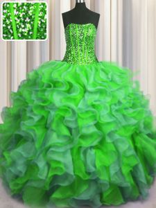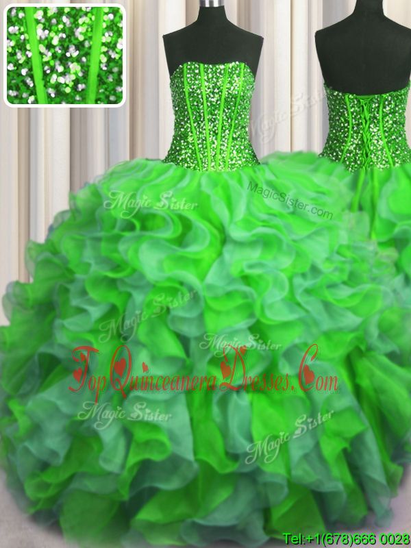 Cute Blue Ball Gowns V-neck Sleeveless Organza Floor Length Lace Up Appliques and Ruffles Quinceanera Dress