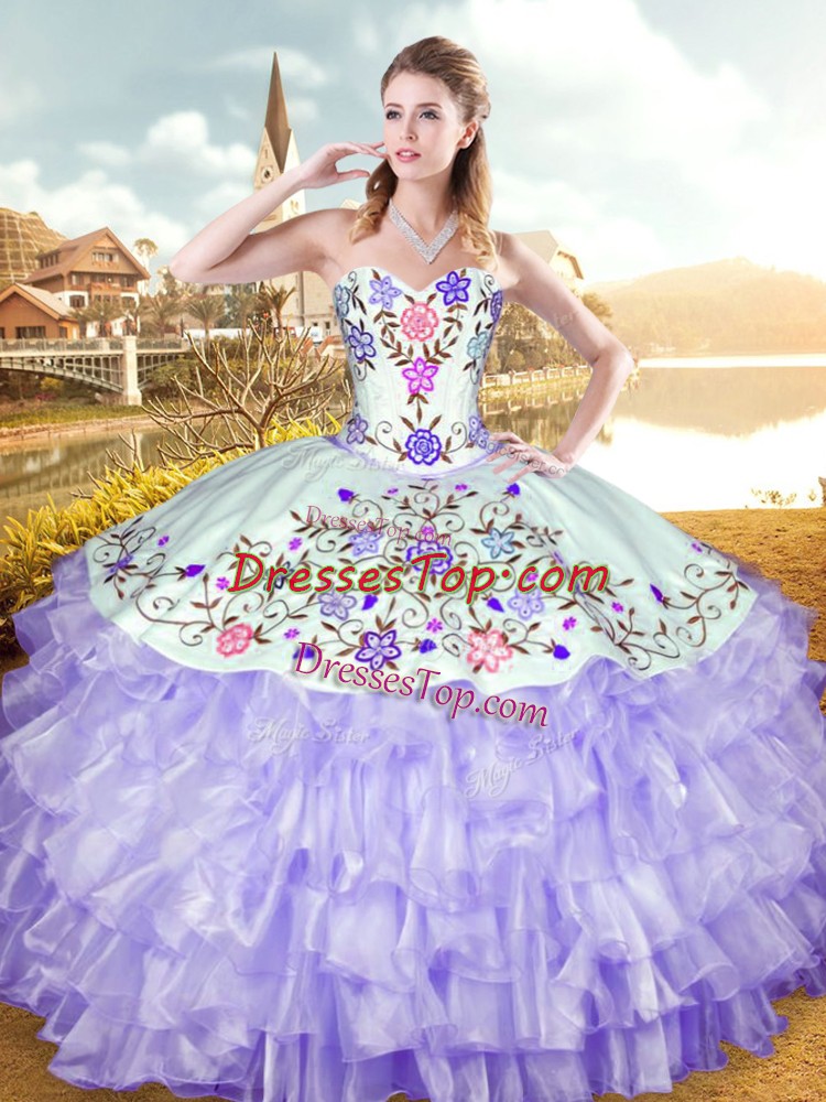Cute Embroidery and Ruffled Layers Sweet 16 Dress Lavender Lace Up Sleeveless Floor Length