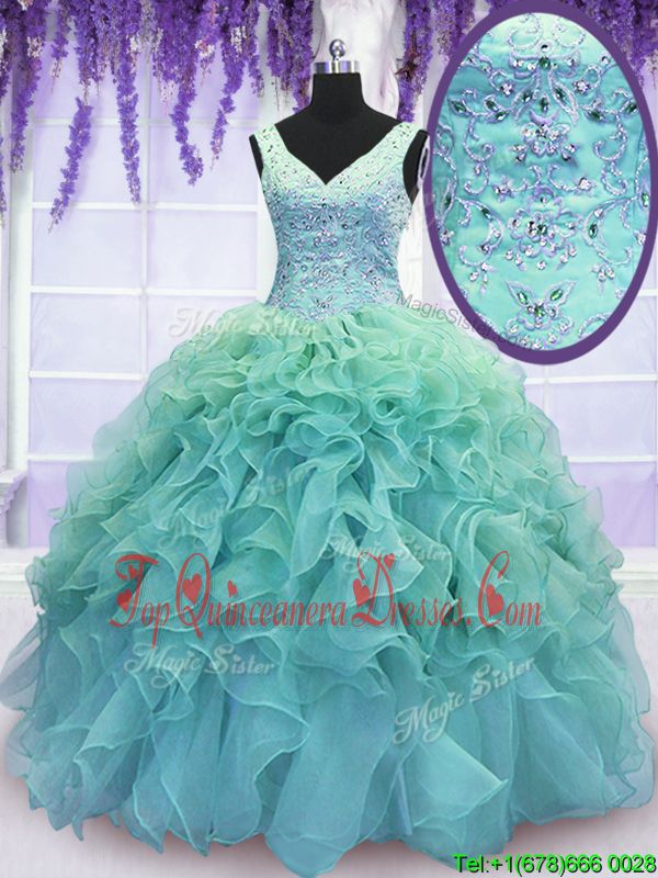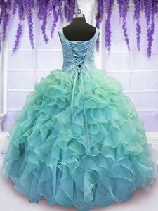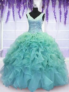 Cute Floor Length Blue 15th Birthday Dress Organza Sleeveless Beading and Embroidery and Ruffles