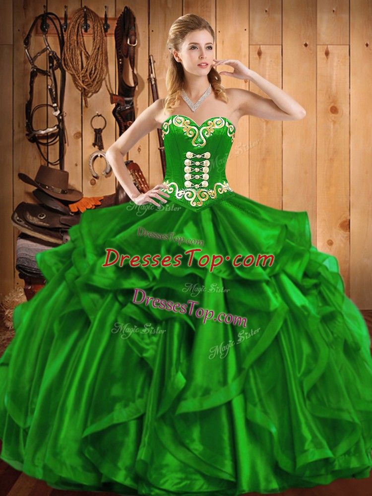 Cute Green Ball Gowns Embroidery and Ruffles Ball Gown Prom Dress Lace Up Organza Sleeveless Floor Length