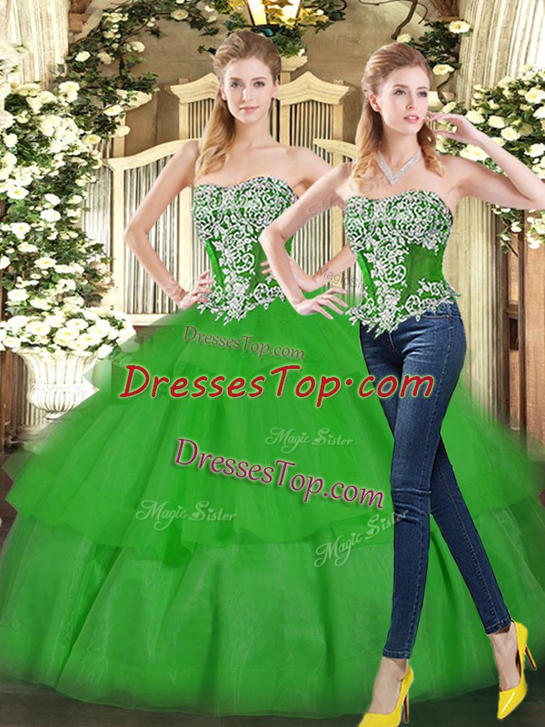 Cute Green Strapless Neckline Beading and Ruffled Layers 15th Birthday Dress Sleeveless Lace Up