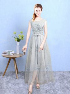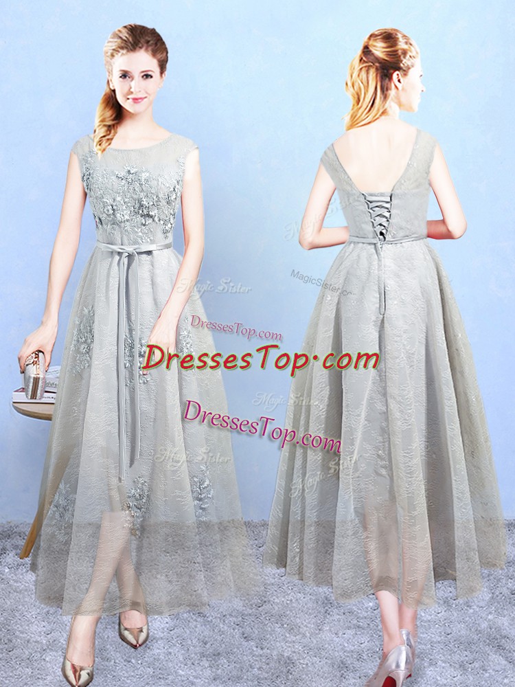 Cute Grey Sleeveless Ankle Length Appliques Lace Up Dama Dress
