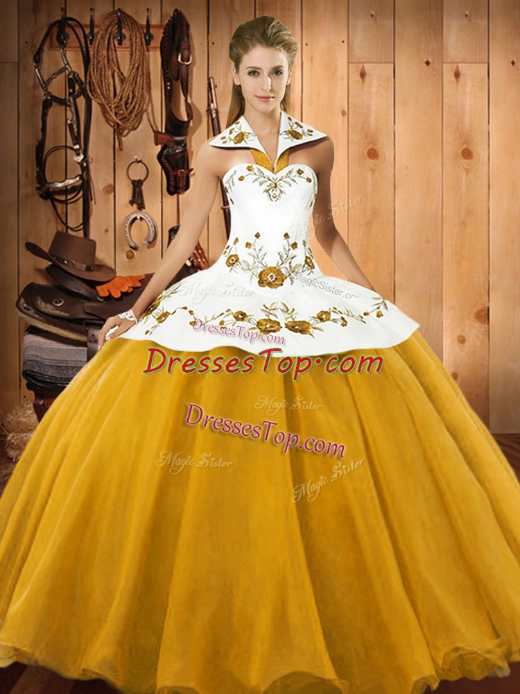 Cute Halter Top Sleeveless Lace Up 15 Quinceanera Dress Gold Satin and Tulle