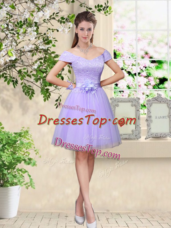 Cute Lilac A-line Lace and Belt Court Dresses for Sweet 16 Lace Up Tulle Cap Sleeves Knee Length