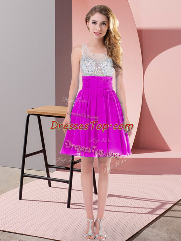 Cute Mini Length Fuchsia Vestidos de Damas Chiffon Sleeveless Beading