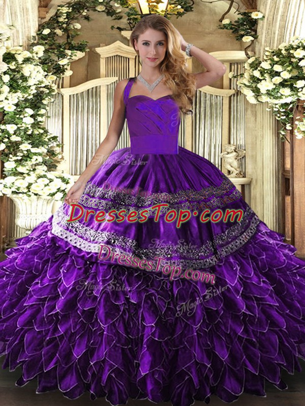Cute Purple Sleeveless Floor Length Embroidery and Ruffles Lace Up Ball Gown Prom Dress