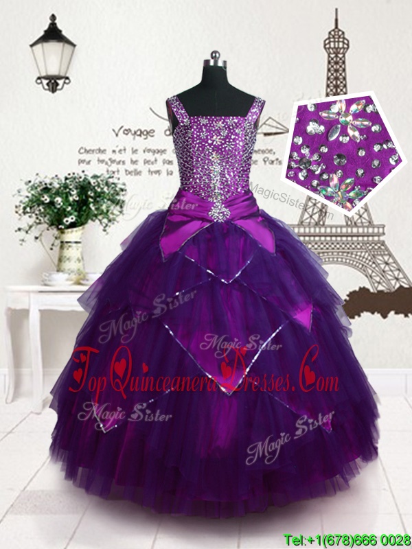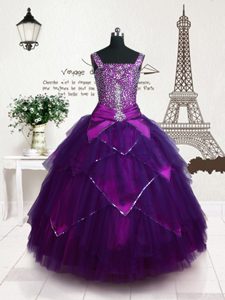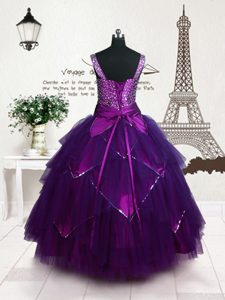 Cute Purple Tulle Lace Up Girls Pageant Dresses Sleeveless Floor Length Belt