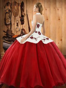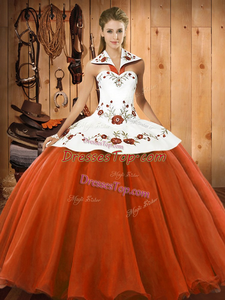 Cute Satin and Tulle Halter Top Sleeveless Lace Up Embroidery Quinceanera Dresses in Orange Red