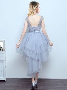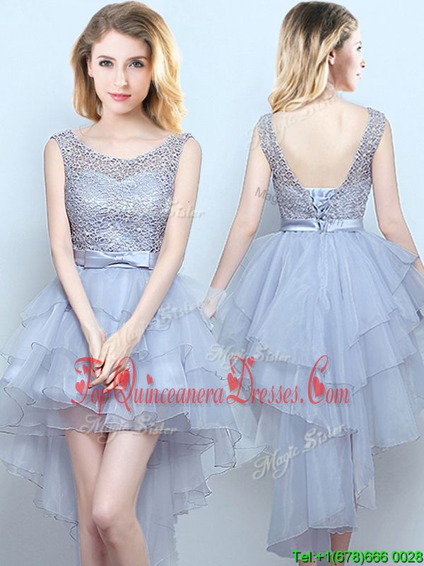 Cute Scoop Grey Sleeveless Organza and Lace Lace Up Vestidos de Damas for Prom and Party and Wedding Party