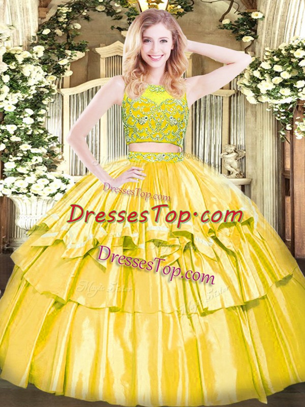 Cute Sleeveless Tulle Floor Length Zipper Ball Gown Prom Dress in Yellow with Beading and Ruffled Layers