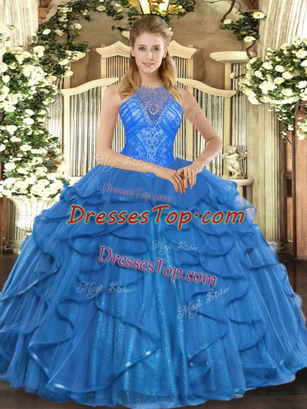 Cute Teal 15th Birthday Dress Military Ball and Sweet 16 and Quinceanera with Beading and Ruffles High-neck Sleeveless Lace Up