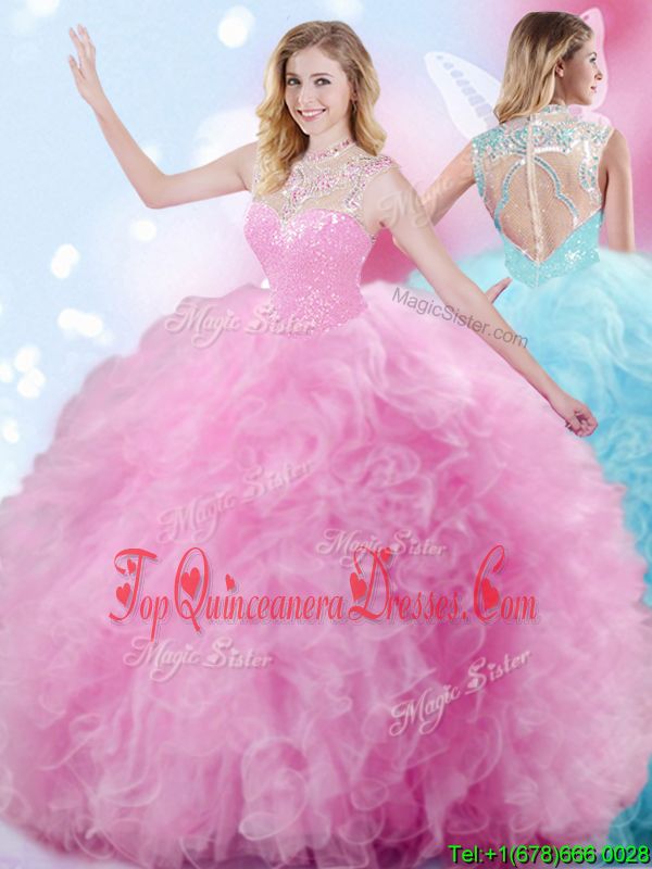 Cute Three Piece Spaghetti Straps Sleeveless Quince Ball Gowns Floor Length Beading and Ruffles and Pick Ups Peach Organza