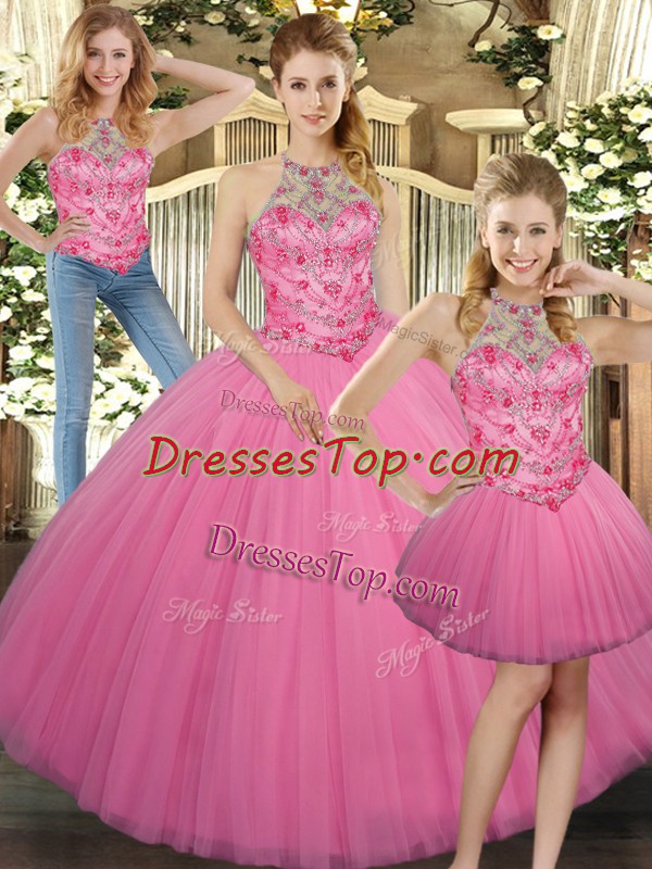 Cute Three Pieces Sweet 16 Dresses Rose Pink Halter Top Tulle Sleeveless Floor Length Lace Up