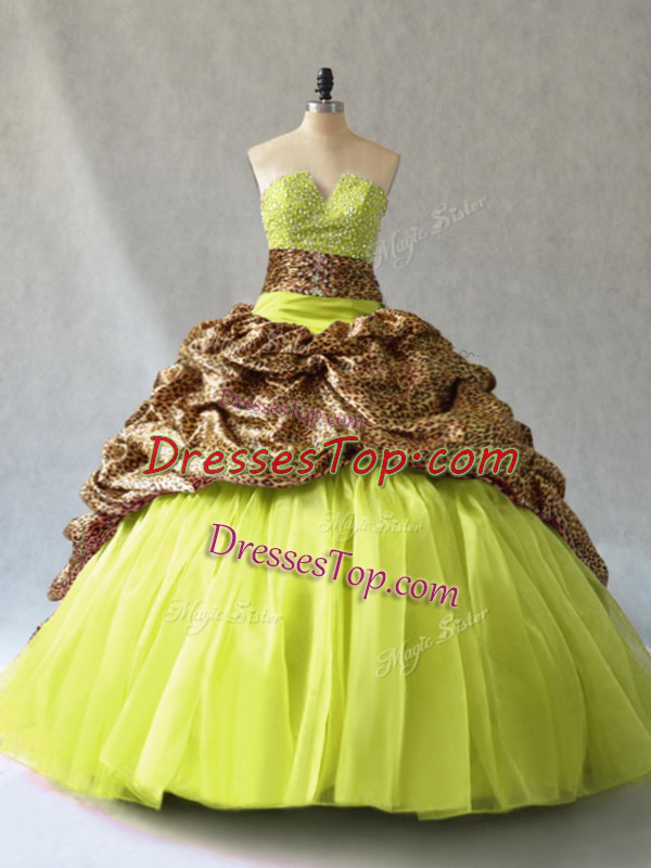 Cute Yellow Green Sleeveless Brush Train Beading Quinceanera Gown