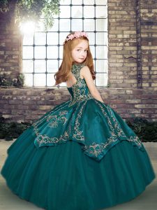 Dark Green Ball Gowns Tulle Straps Sleeveless Beading and Embroidery Floor Length Lace Up Kids Formal Wear