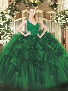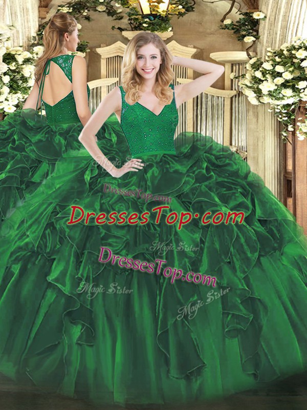 Dark Green Organza Backless Quinceanera Gown Sleeveless Floor Length Beading and Lace and Ruffles