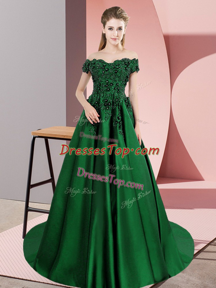 Dark Green Quinceanera Dress Satin Court Train Sleeveless Lace