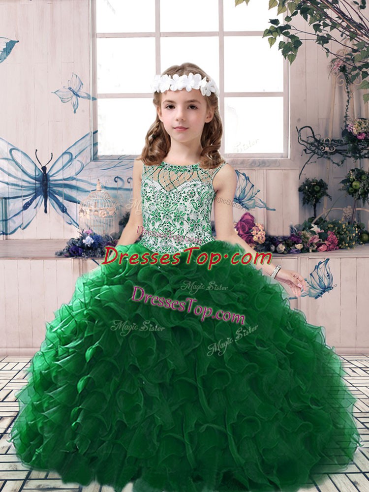 Dark Green Sleeveless Floor Length Beading and Ruffles Lace Up Kids Pageant Dress