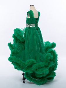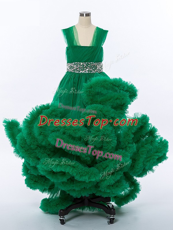 Dark Green Tulle Lace Up Straps Sleeveless High Low Pageant Dress Toddler Beading and Hand Made Flower